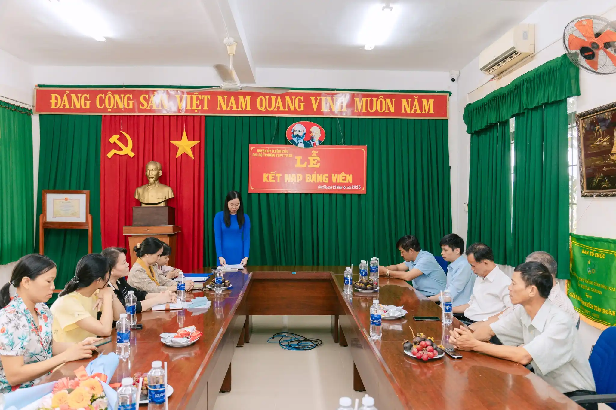 Phát biểu tại buổi lễ, đồng chí Nguyễn Hoàng Khả Tú - Phó Bí thư Chi bộ đã chúc mừng 05 đồng chí đảng viên mới được kết nạp, đồng chí Phó Bí thư nhấn mạnh: trưởng thành từ phong trào Đoàn, được đứng vào hàng ngũ của Đảng Cộng sản Việt Nam là một vinh dự của người đoàn viên, chính vì thế các đồng chí phải không ngừng tu dưỡng, học tập, rèn luyện, nâng cao năng lực, thực hiện tốt nhiệm vụ của người đảng viên, truyền cảm hứng cho các bạn, các em học sinh phấn đấu trở thành đoàn viên ưu tú tiến bước dưới cờ Đảng.