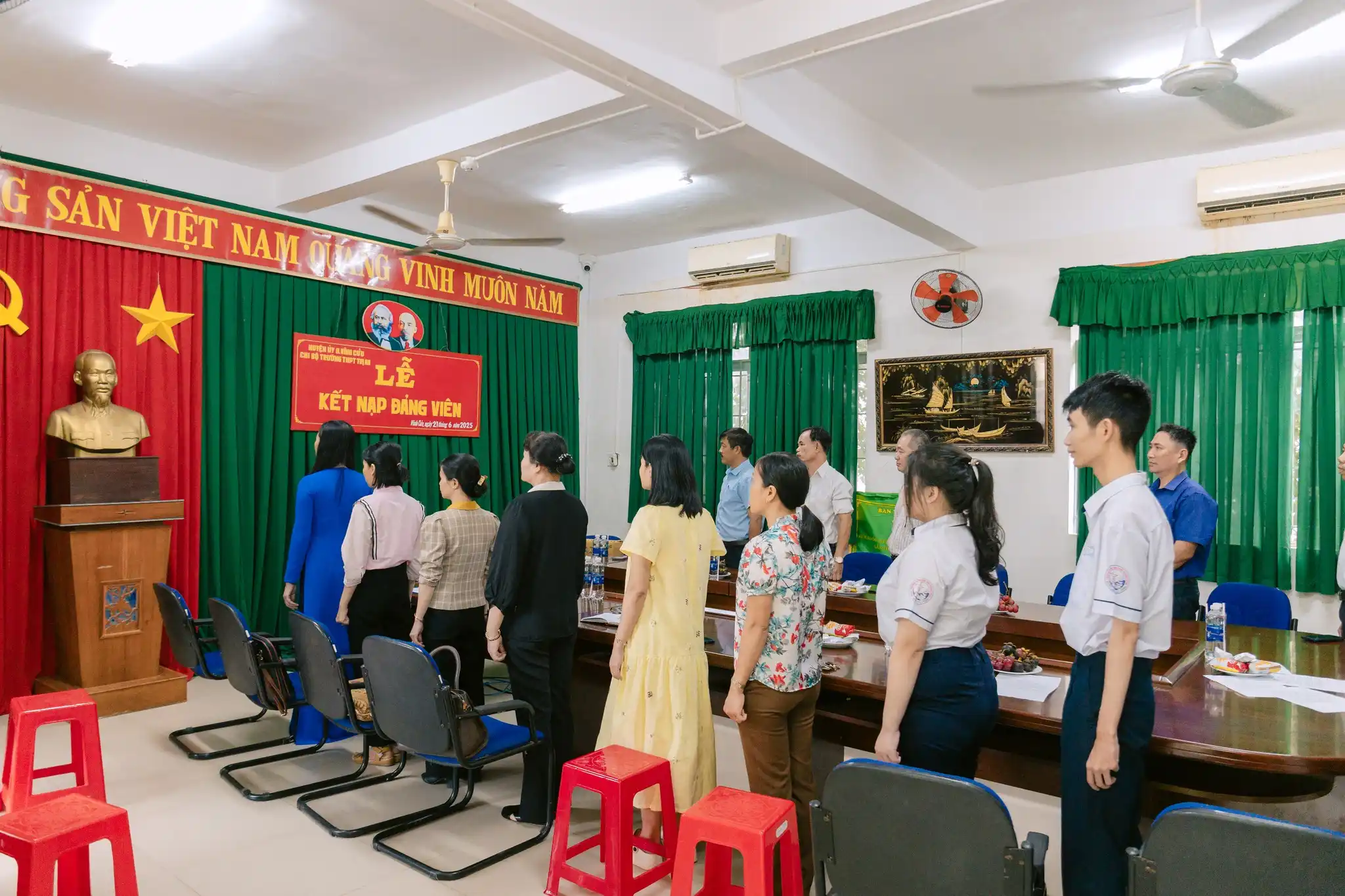 Lễ kết nạp đảng viên được diễn ra trong không khí trang nghiêm, đúng theo quy định của Điều lệ Đảng. Tại buổi lễ, đồng chí Nguyễn Hoàng Khả Tú - Phó Bí thư Chi bộ đã trao Quyết định kết nạp Đảng cho 05 đoàn viên học sinh ưu tú.