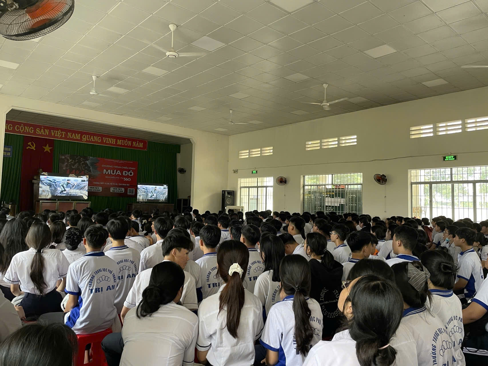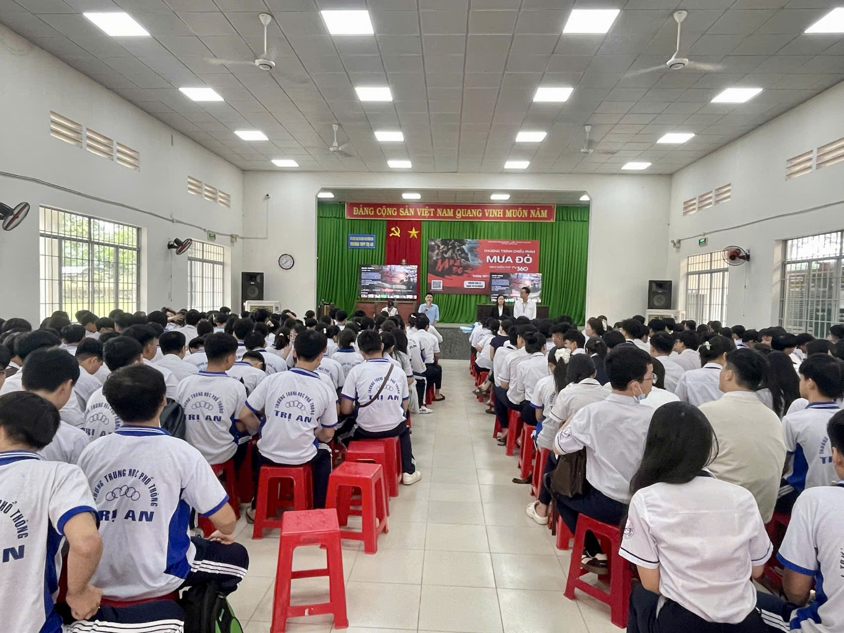Trong hai ngày 04, 05/12/2025, tập thể CB-GV-NV và hơn 1350 học sinh trường THPT Trị An đã đến xem bộ phim “MƯA ĐỎ” – tác phẩm tái hiện một giai đoạn lịch sử hào hùng của dân tộc Việt Nam. Bộ phim dựa trên những câu chuyện có thật, kể về sự hy sinh, mất mát và tinh thần chiến đấu kiên cường của quân và dân ta trong những ngày tháng khốc liệt của chiến tranh.