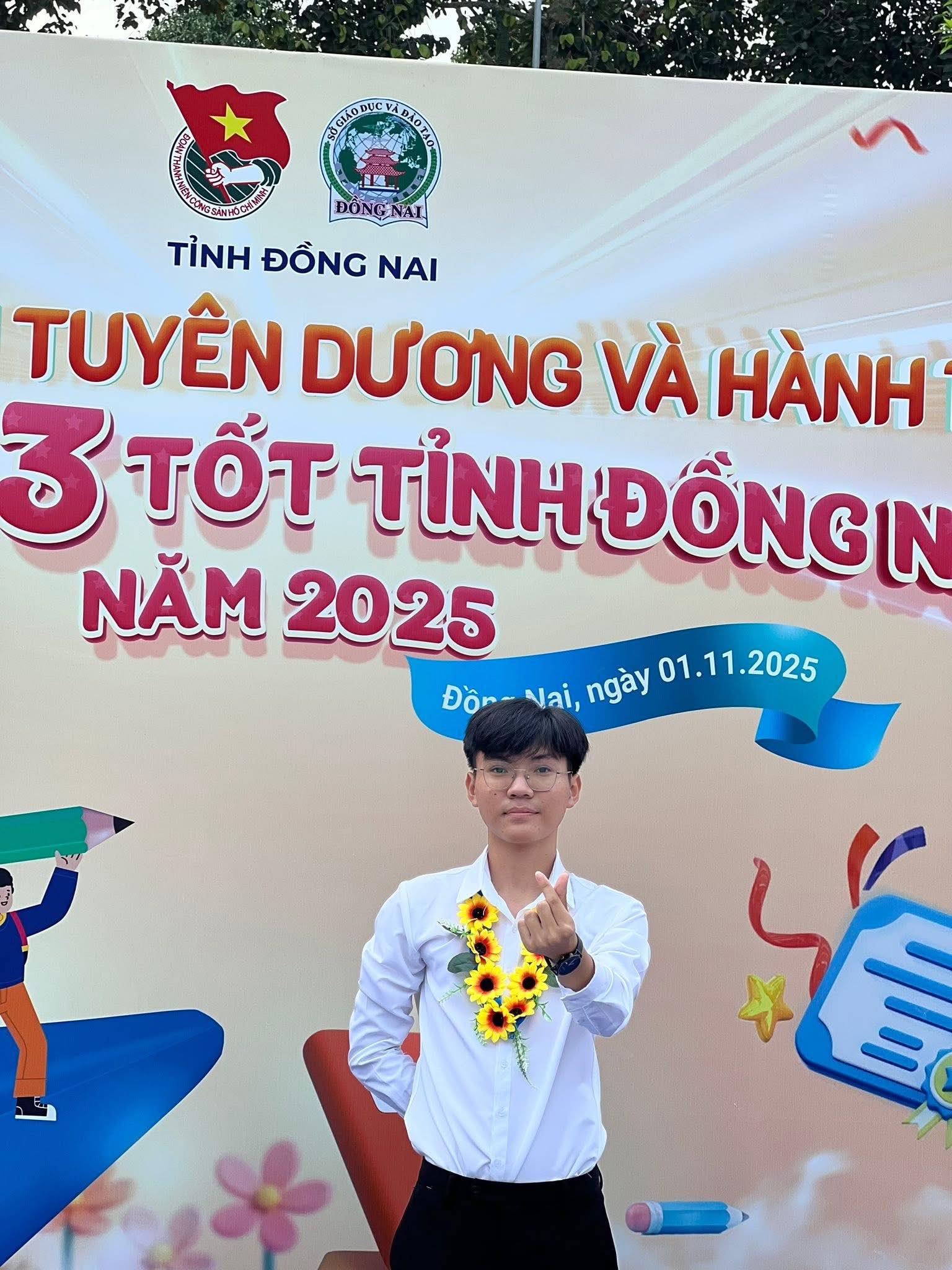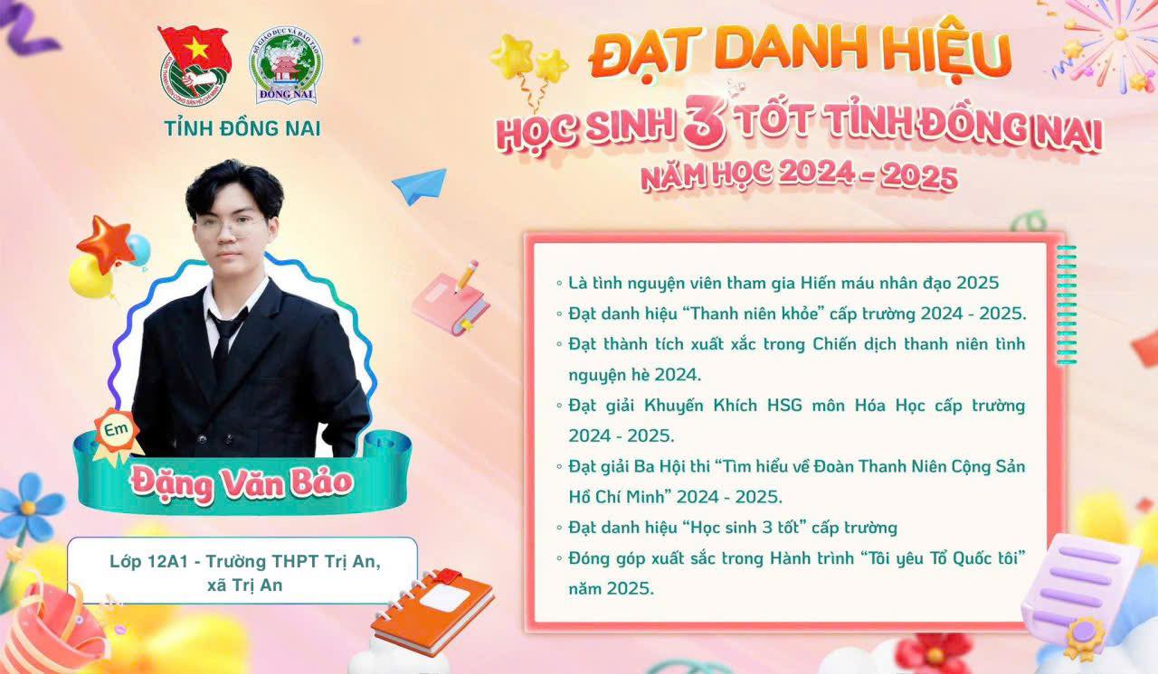Em Đặng Văn Bảo - học sinh lớp 12A1 trường THPT Trị An đã xuất sắc đạt danh hiệu "HỌC SINH 3 TỐT" tỉnh Đồng Nai năm học 2024 - 2025
