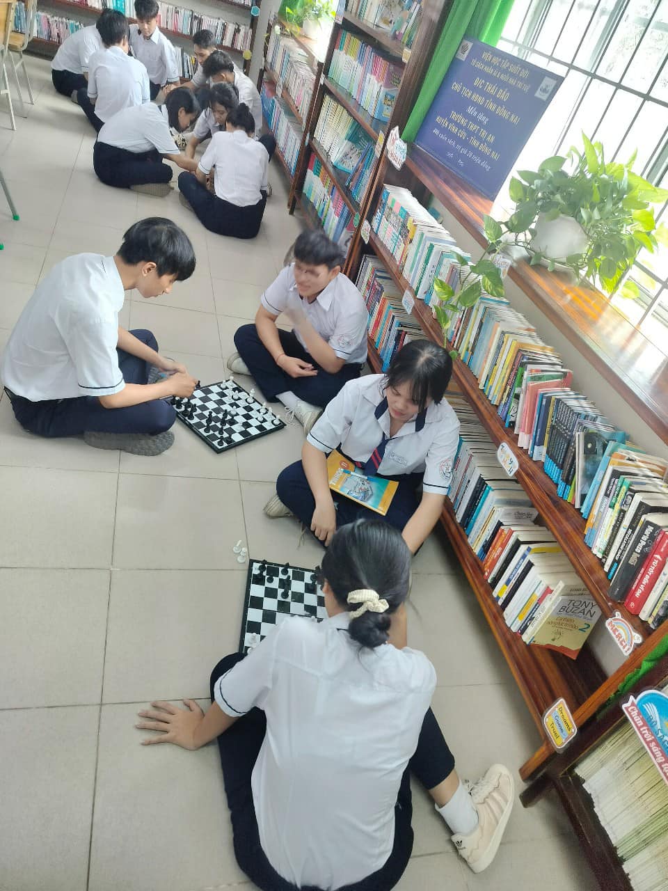 Không chỉ sôi động với các hoạt động thể thao, giờ ra chơi tại Trường THPT Trị An còn có những góc nhỏ thật yên bình. Ở đó, nhiều bạn học sinh lựa chọn đọc sách để mở rộng kiến thức, hay cùng nhau chơi cờ – rèn luyện tư duy, sự tập trung và tính kiên nhẫn.