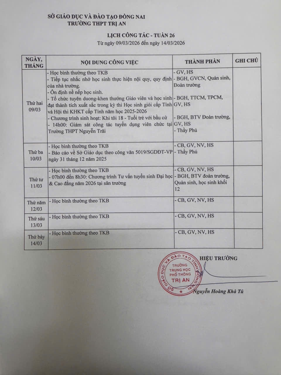 Lịch công tác tuần 26