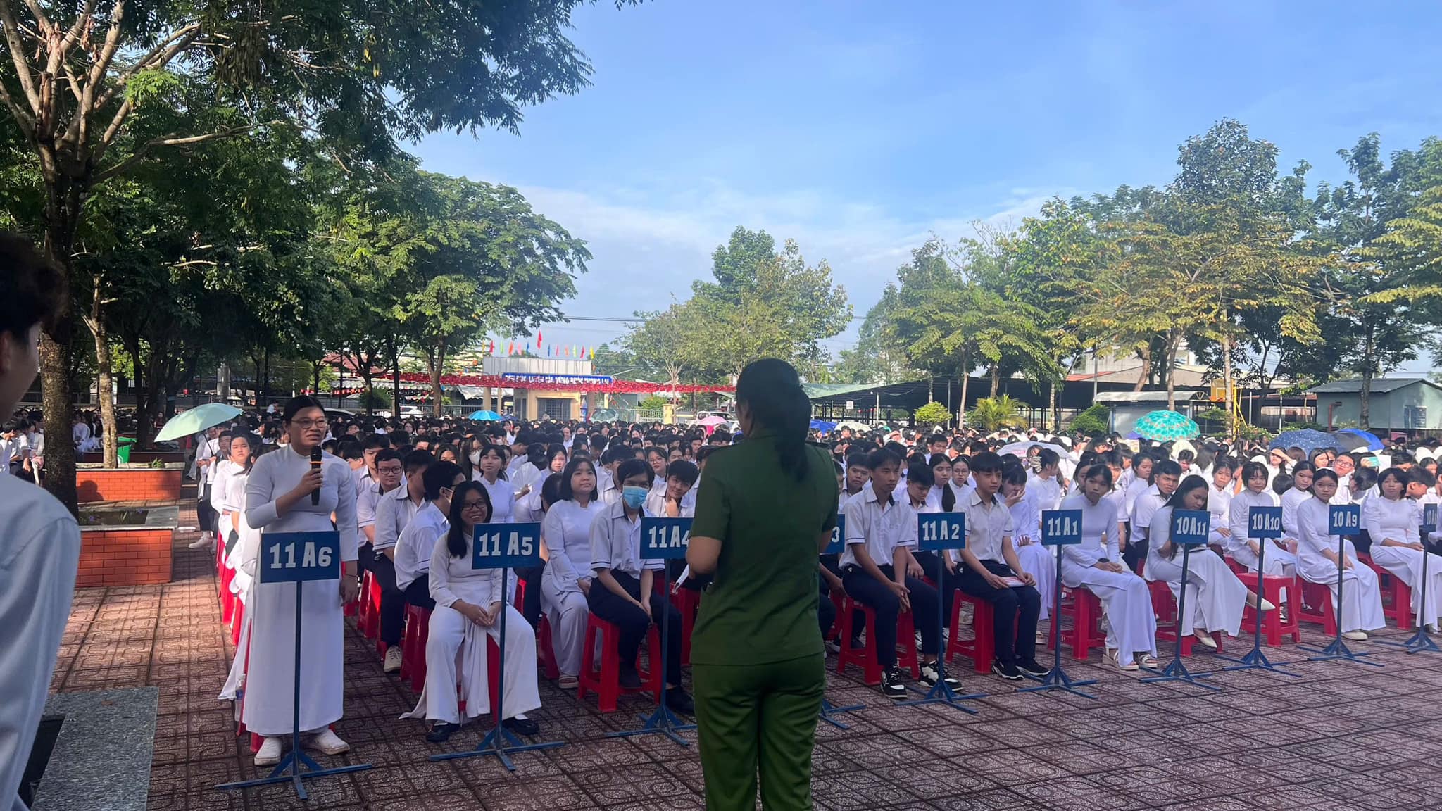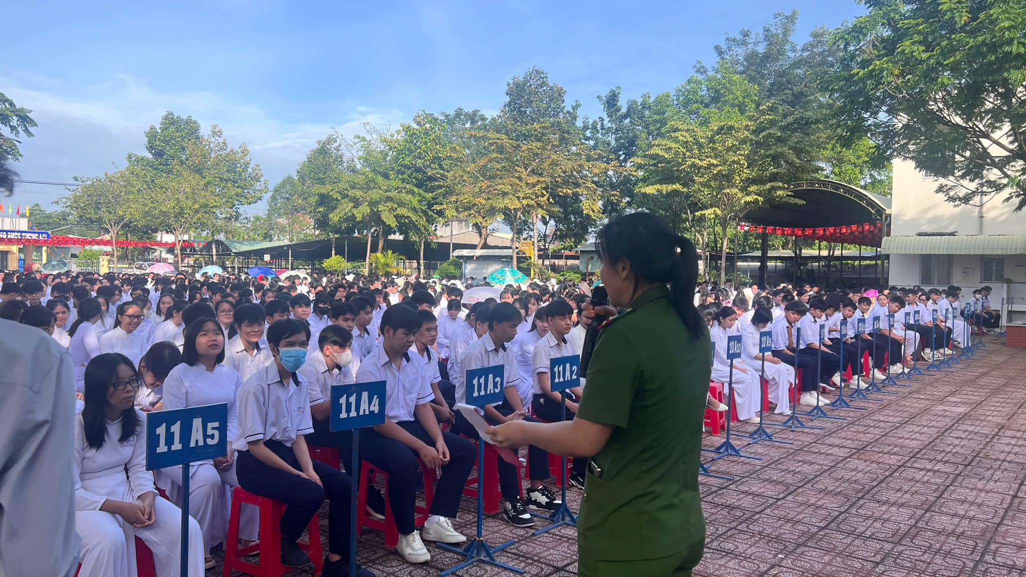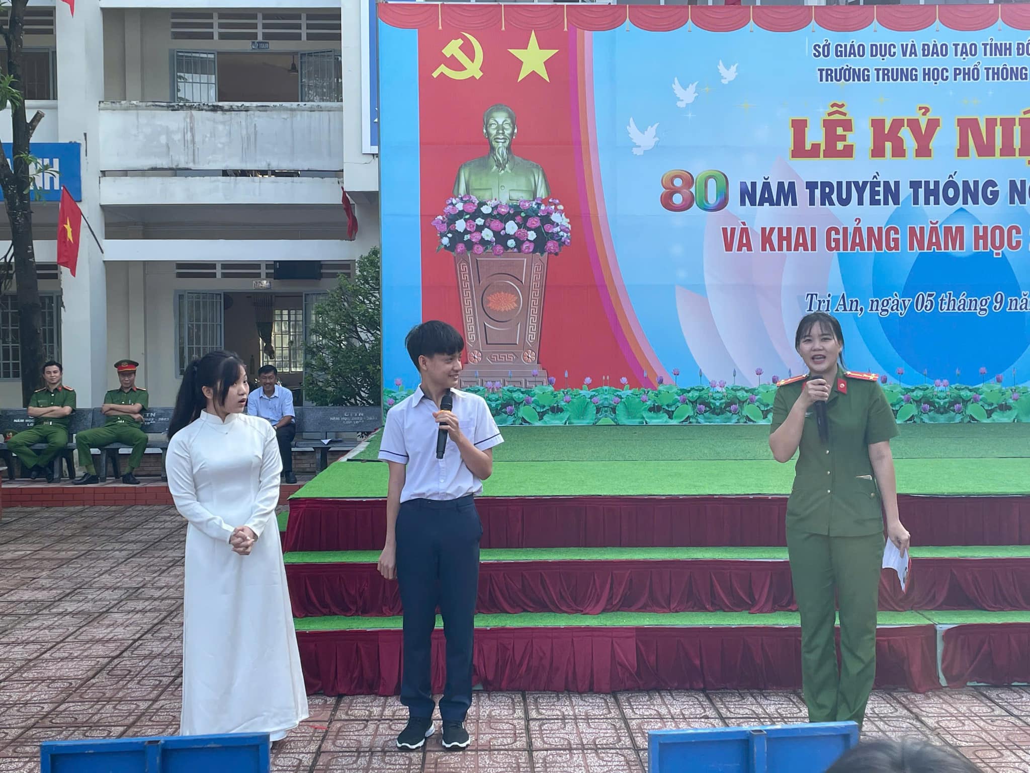Hoạt động sinh hoạt dưới cờ đầu tiên năm học 2025-2026 của 1380 học sinh trường THPT Trị An với chủ đề An toàn giao thông và phòng chống bạo lực học đường.