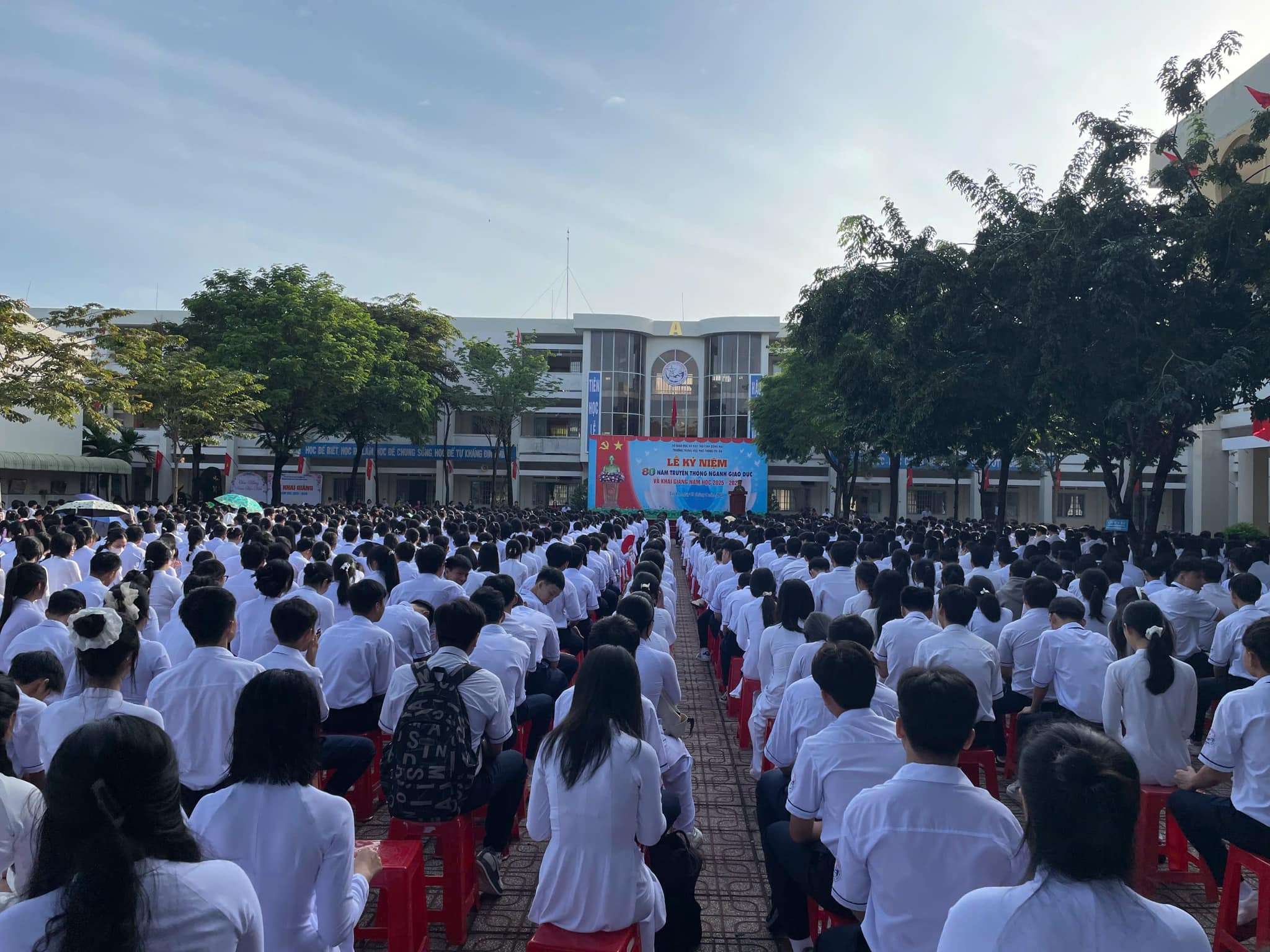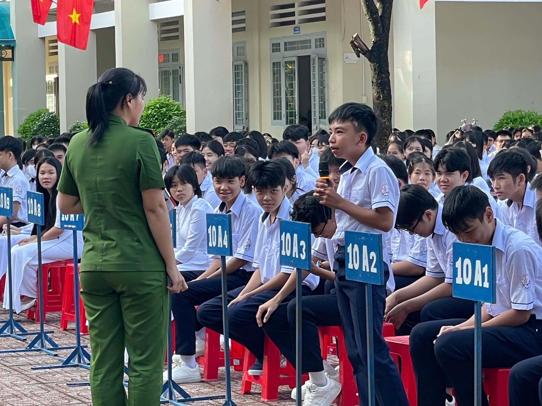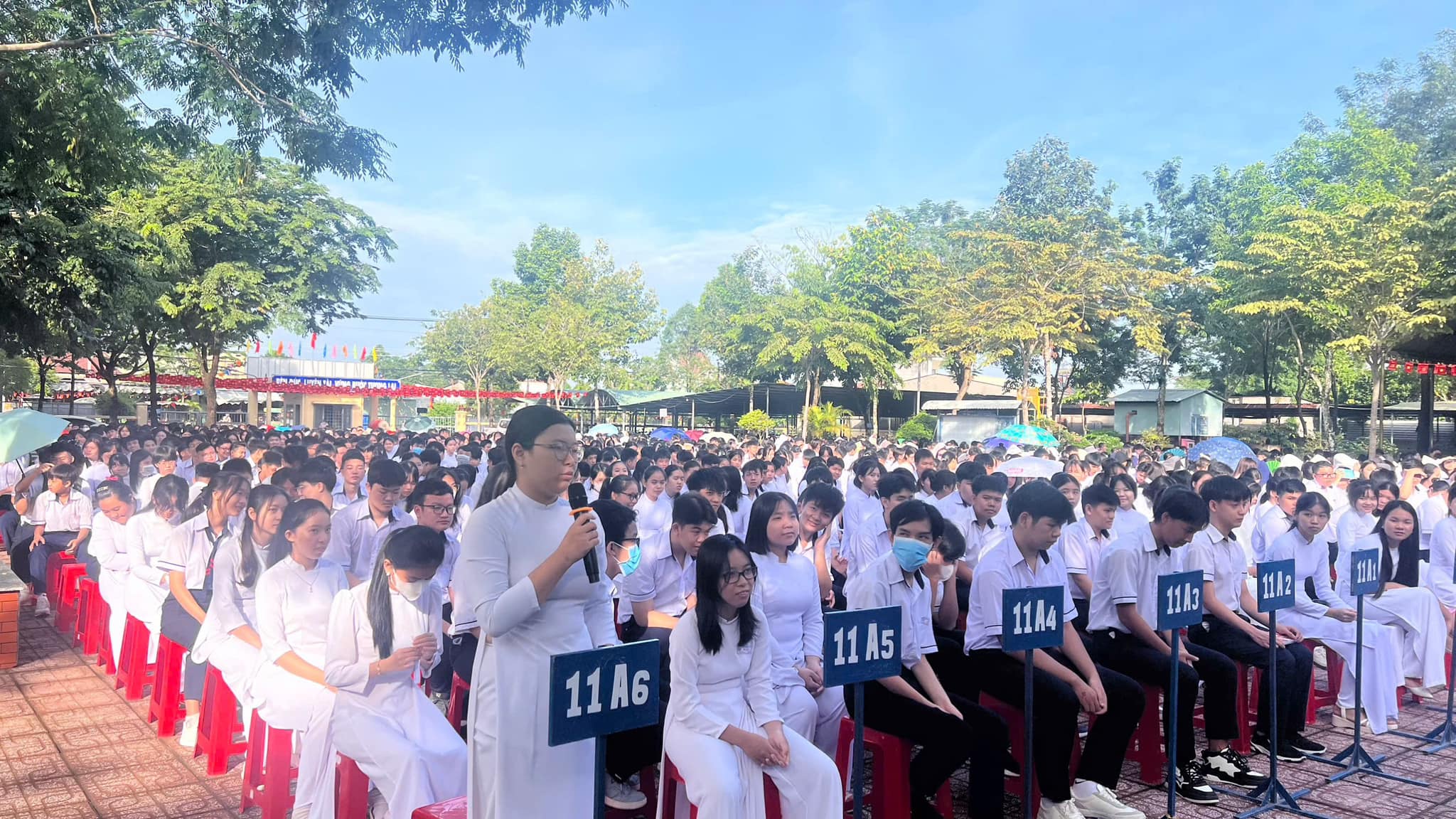 Hoạt động sinh hoạt dưới cờ đầu tiên năm học 2025-2026 của 1380 học sinh trường THPT Trị An với chủ đề An toàn giao thông và phòng chống bạo lực học đường.